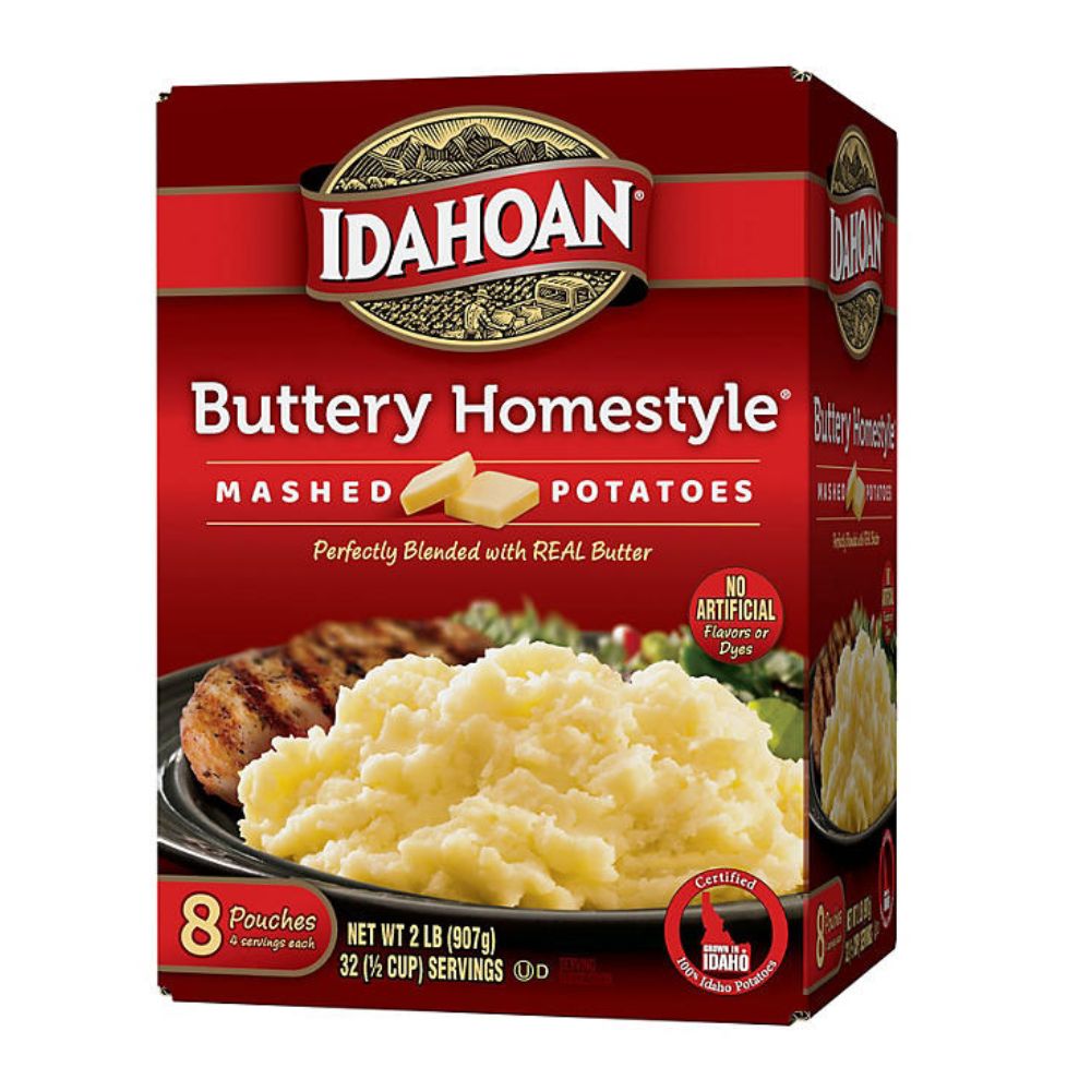 Idahoan Buttery Homestyle Mashed Potatoes are made from potatoes and include 8 individual pouches. Each pouch can be prepared using water, milk and butter. This product has a smooth texture and a buttery taste.