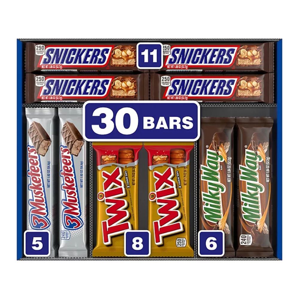 This 30-piece variety pack is filled with full size favorites SNICKERS, TWIX, 3 MUSKETEERS and Milky Way bars. With 30 individually wrapped full-size bars, it’s easy to share with friends, hand out at events or stash a few away for those “just because” moments. This pack is a go for candy lovers of all ages.